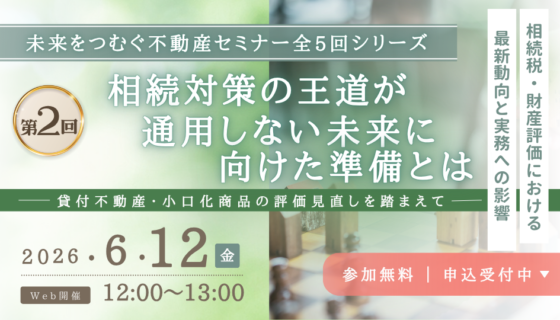 Web 無料【Web受講 26/06/12】未来をつむぐ不動産セミナー全5回シリーズ (第2回) 相続対策の王道が通用しない未来に向けた準備とは ~貸付不動産・小口化商品の評価見直しを踏まえて~